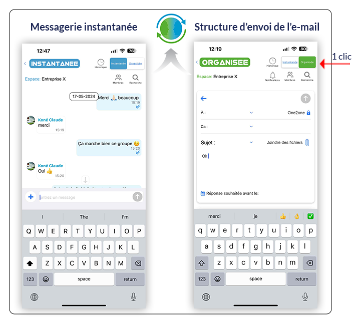 Le passage de l’interface de messagerie instantanée à l’interface de la structure du mail des discussions organisées se fait par un simple Clic. Cette fonctionnalité assure une transition sans efforts, permettant aux utilisateurs de s’adapter rapidement selon les exigences de communication.