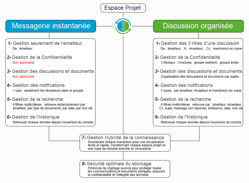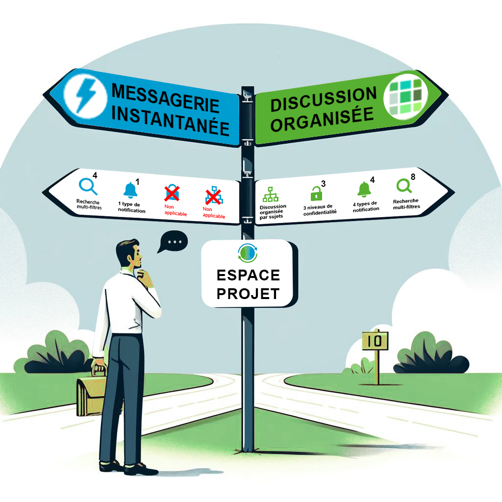 • Discussion organisée : Privilégiez cette approche pour des discussions qui impliquent plusieurs points, nécessitent le partage de documents, ou où le suivi des échanges antérieurs peut influencer les décisions futures.