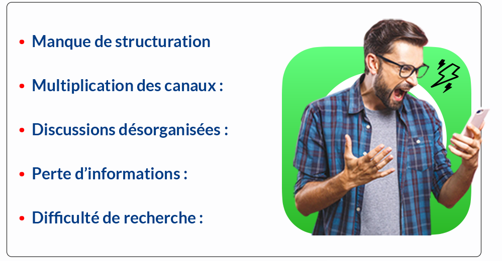 *Solution* : Face2faces Hybride offre une solution aux discussions désorganisées en fournissant des outils de structuration avancés. Ceux-ci permettent de classer les conversations par thèmes et sujets dynamiques, de centraliser les échanges dans un espace projet unique, et de gérer la confidentialité en 3 niveaux (one2one, équipe restreinte, équipe entière). Ces fonctionnalités garantissent une organisation claire, un accès rapide aux informations pertinentes et une réduction des risques d’erreurs.