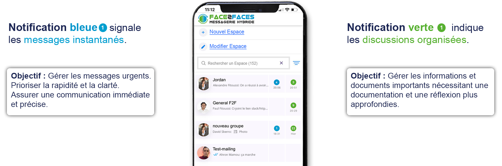 Face2Faces Hybride permet aux utilisateurs de basculer sans effort entre communication instantanée discussions organisées, adaptant leur méthode de communication aux besoins spécifiques du moment.